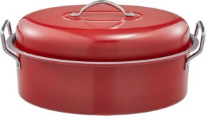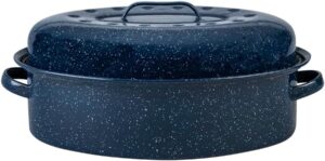 The covered design self-bastes your turkey while it cooks. The carbon steel heats evenly. The non-stick porcelain surface cleans up in minutes. And at around $35-45, it won’t wreck your budget.